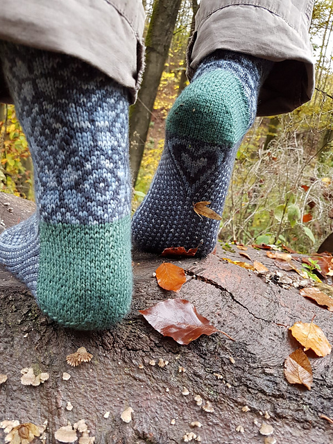 Носки вяжутся спицами от манжеты к мыску с пяткой бумеранг, на клине пятки вывязывается сердечко. Узор стопы отличается от основного узора носка. Манжету, пятку и мысок можно связать как контрастным цветом, так и цветом узора - не бойтесь экспериментировать.