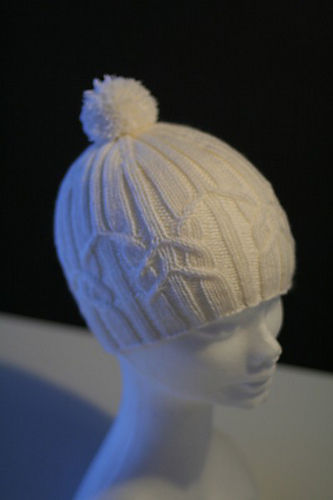 Облегающая вязаная шапка спицами с мотивами переплетений кос.