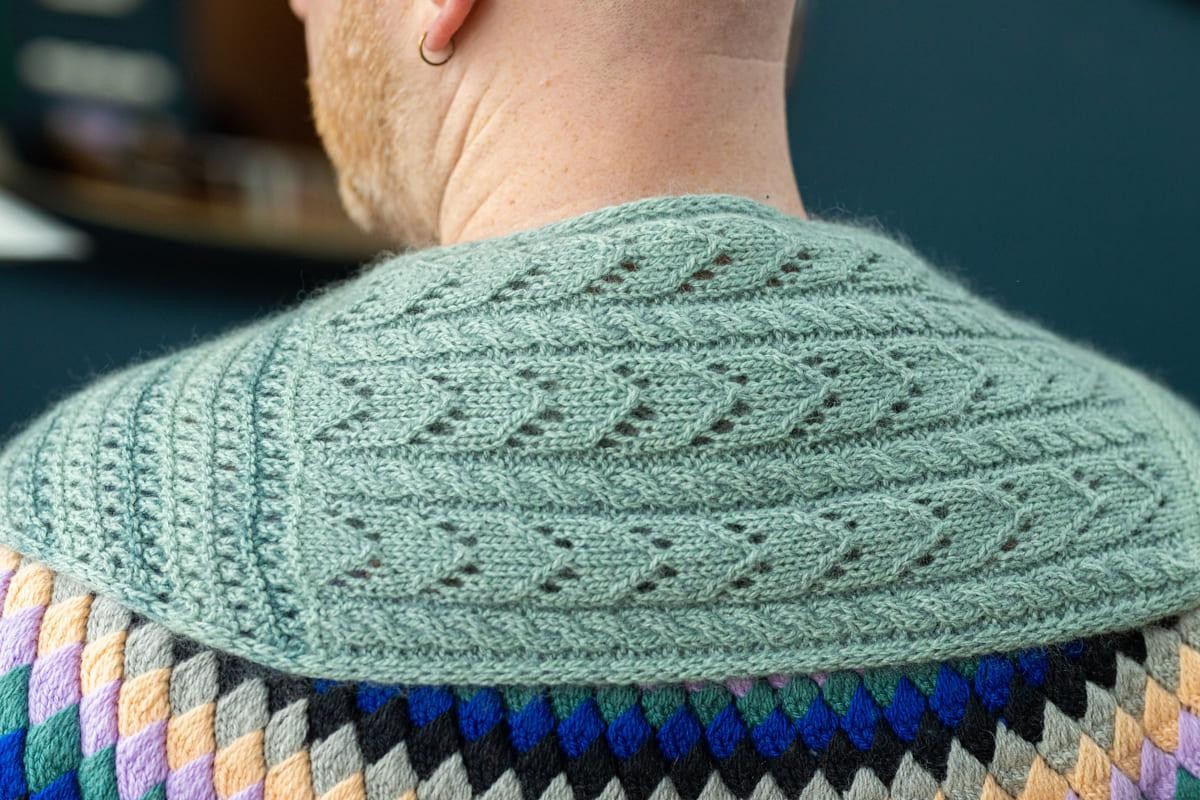Прибавки по одному краю с соответствующими убавками постепенно превращают полотно в маленький шарфик. Для создания дизайна использованы два мотка (всего 100 г) шерсти West Wool Bicycle и три оттенка шерсти West Wolf Glowhair. Мохер lace weight мраморных цветов вместе с шерстью fingering weight создают эффект ореола.