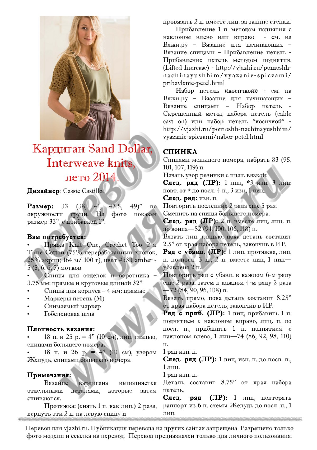 Вязание кардигана Sand Dollar, Interweave knits, лето 2014.