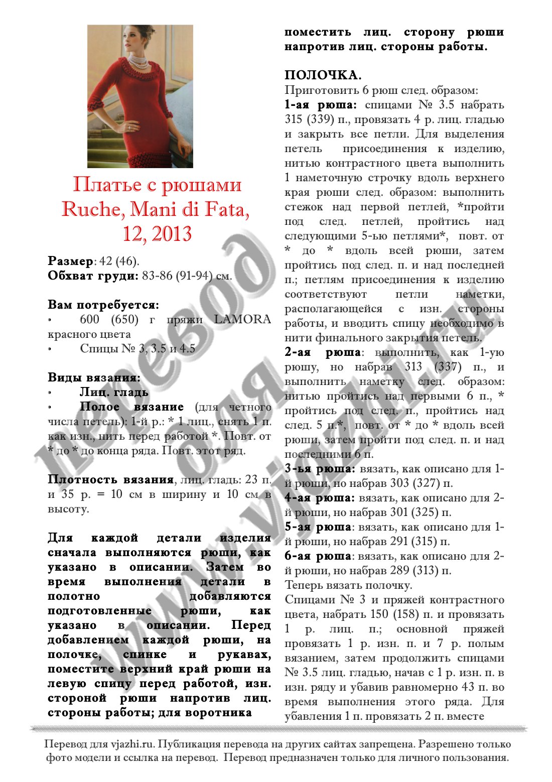 Подбираете идеальный наряд? Короткое платье, рукава три четверти, с рюшами. Жемчужный воротник по горловине, и Вы будете звездой вечера. Вязание платья выполнено из пряжи Lamora.