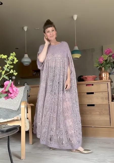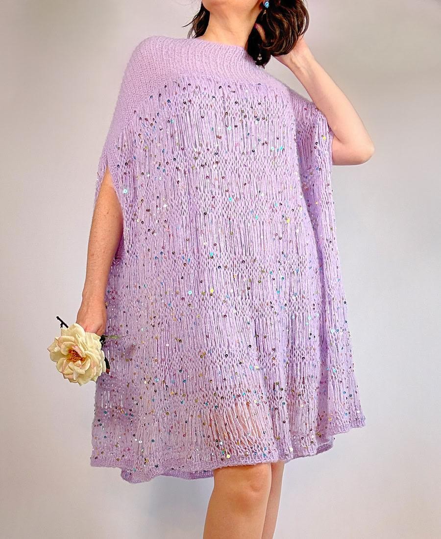 Словно сотканное из утреннего тумана, оно окутывает фигуру воздушным облаком, переливаясь в свете, как россыпь звёзд на ночном небе. Лёгкая пряжа, создаёт изысканную фактуру, которая одновременно выглядит утончённо и уютно. А вкрапления пайеток придают платью особое очарование — они ловят свет, создавая завораживающую игру бликов, будто платье оживает с каждым движением.