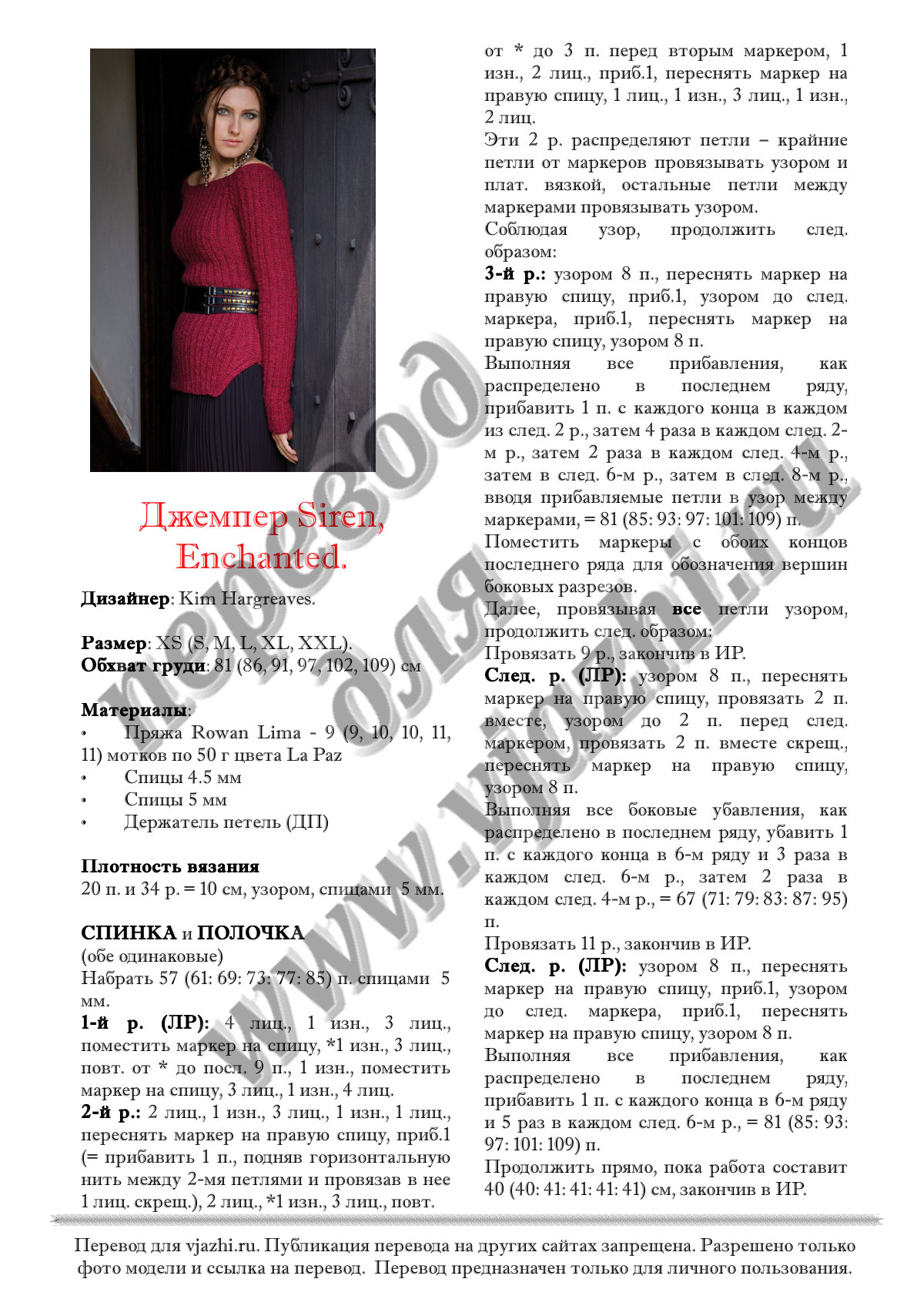 Перевод описания вязания джемпера с английского языка.