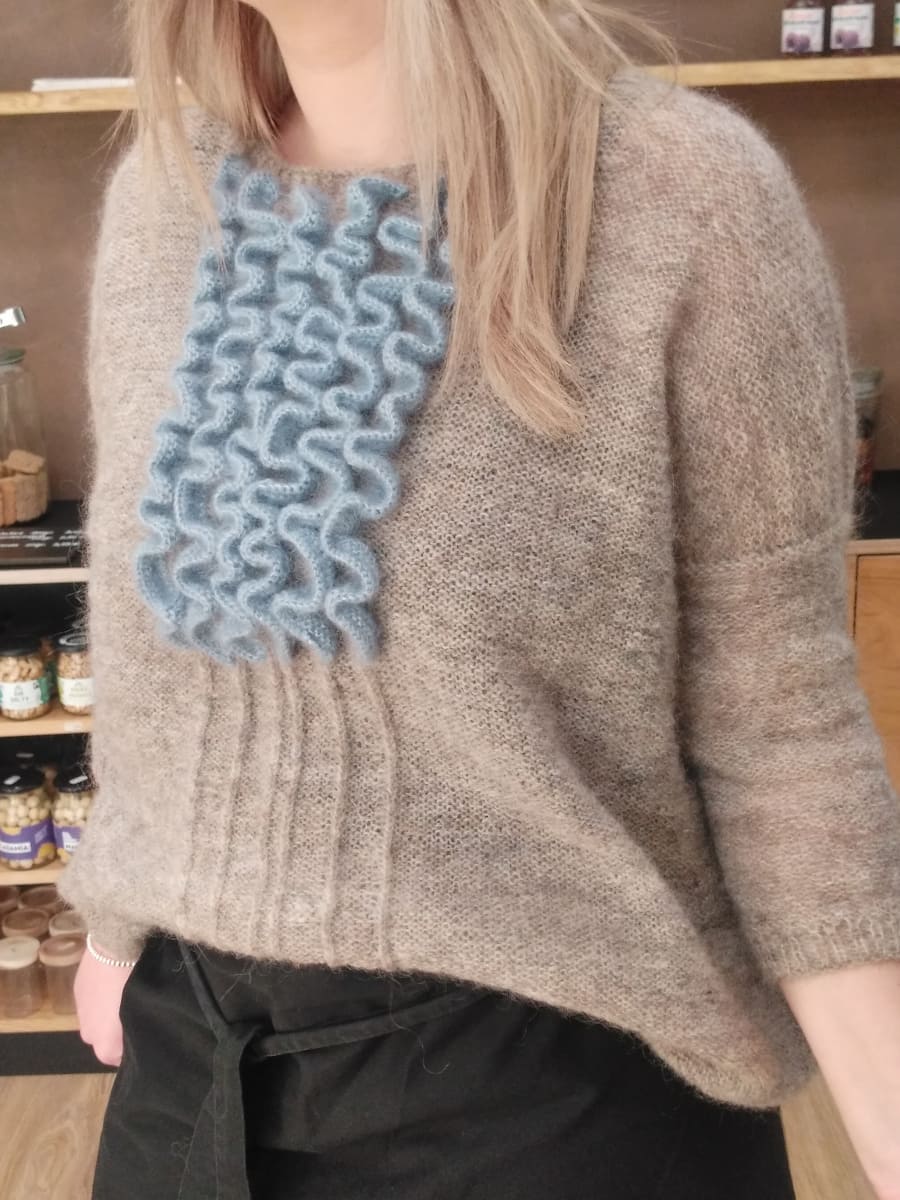 Дизайн был создан как открытая площадка для цветовых решений, где вы можете выбирать не только цвета тела вашей блузки, но и экспериментировать с цветами рюш, что дает вам возможность настроить внешний вид – вы можете создать градиентный образ, нанося более светлые рюши на внешние столбики и постепенно затемняя их по направлению к центру или наоборот. Или используйте рюшу совершенно другого цвета для каждого столбика. Вы даже можете настроить саму рюшу, выполнив часть лицевой гладью в одном цвете, а часть платочной вязкой - в другом.