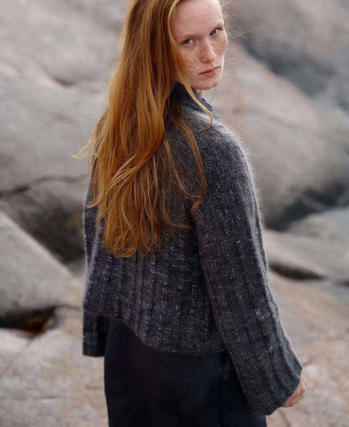 Модель из журнала The Art of Sea (серия дизайнов по мотивам сказок Туве Янсон про муми-троллей). Название свитера Into the Forest (В Глубине Леса) ассоциируется с мистическим персонажем Groke, живущим в глубине леса и наводящим страх на муми-троллей. Но на самом деле Groke олицетворяет одиночество и желание тепла и дружеских отношений.