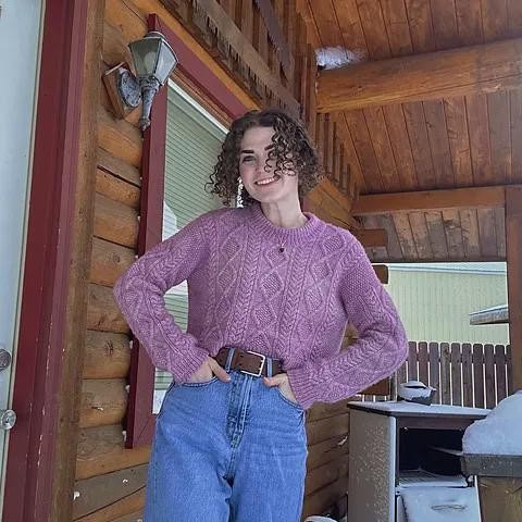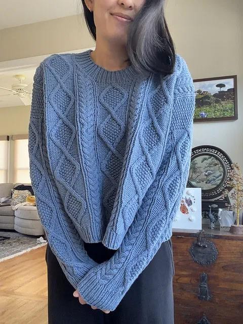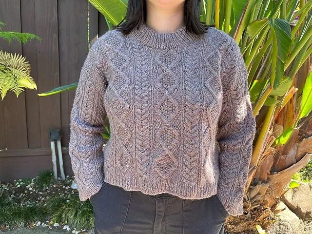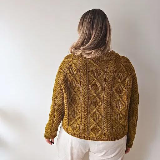 Он вяжется бесшовно сверху вниз с ромбовидным аранским узором, который гораздо проще, чем кажется на первый взгляд, и подходит для вязальщиц, которые только осваивают вязание кос.