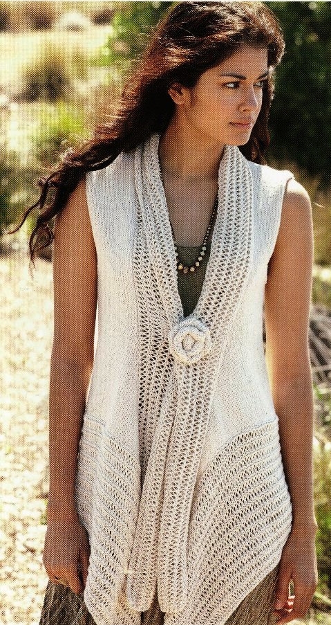 Вязание на спицах женской безрукавки с вязаной брошью.